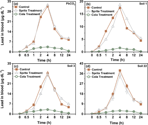 本研究基于体外胃肠模拟和动物模型,发现可乐饮料可降低摄入铅污染土壤颗粒后的血铅水平,成为一种简单有效的降低铅中毒风险的策略。该方法能促使污染土壤中的铅直接通过消化系统排出,从而不被吸收进入血液循环。研究结果显示,可乐能使22种污染土壤中的铅生物可利用性降低32.6% - 98.8%(图1)。在接触铅污染土壤的雄性大鼠和猪中,可乐处理分别使血铅浓度降低32.9% - 96.0%31.5% - 81.5%(图23)。可乐之所以能降低铅的生物利用性,是因为其在消化阶段促进了不溶性磷酸铅沉淀的形成(图4)。这种沉淀可直接通过粪便排出,从而降低了血液对铅的吸收。这些发现表明,饮用可乐可降低意外摄入污染土壤后铅中毒的风险。然而,由于缺乏基于人群的研究,该方法对人体的适用性仍不确定。上述研究结果表明,尽管饮用可乐在动物模型中具有减少摄入土壤后铅吸收的潜力,但在将其作为一种治疗方案应用前,还需进一步探明其在人体中的安全性、有效性以及可能存在的风险。