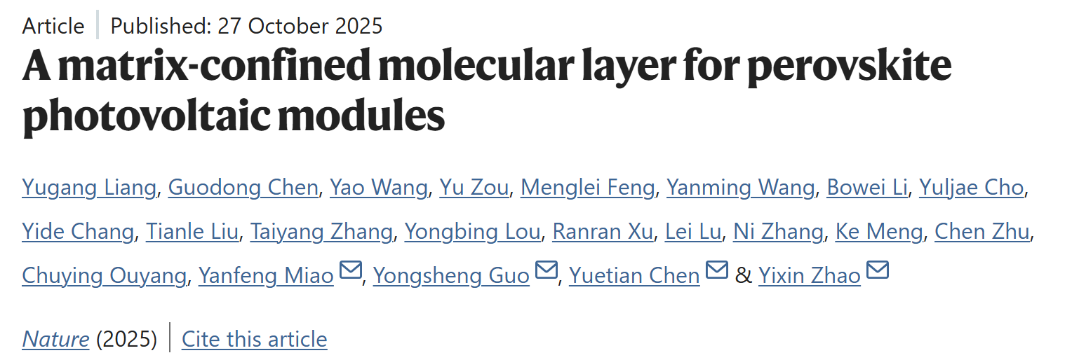 Nature发文!环境学院赵一新团队“基质限域分子层”型电荷传输层设计实现高效率大面积钙钛矿光伏模组