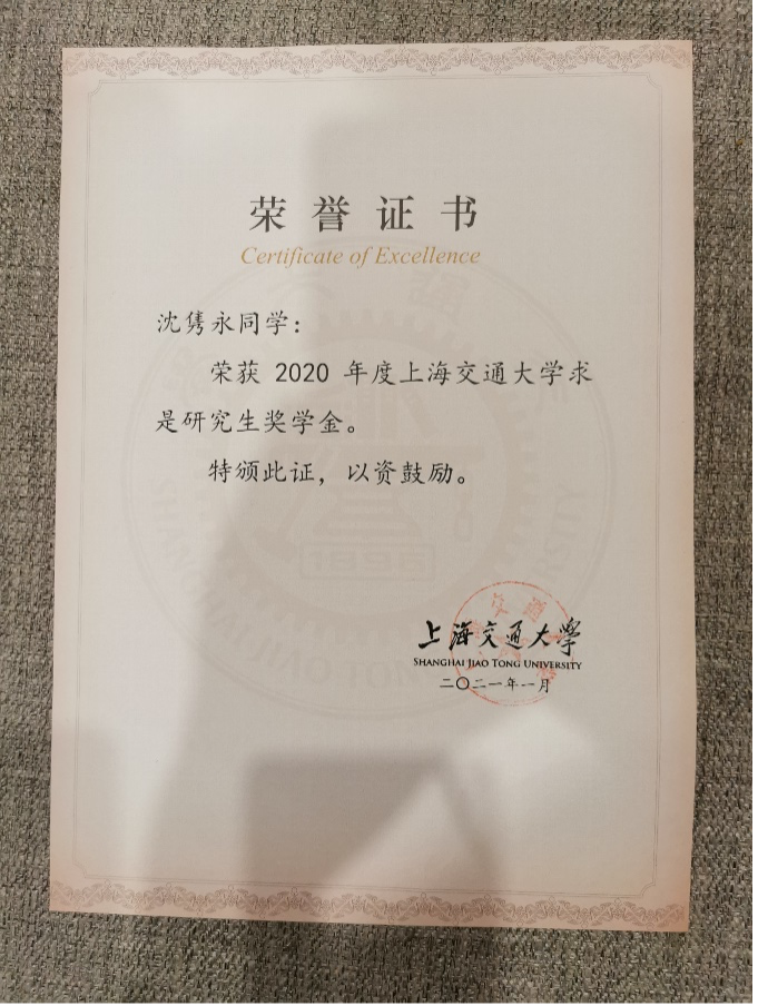 2021年,党员沈隽永荣获2020年度beat365正版唯一官方网站求是研究生奖学金