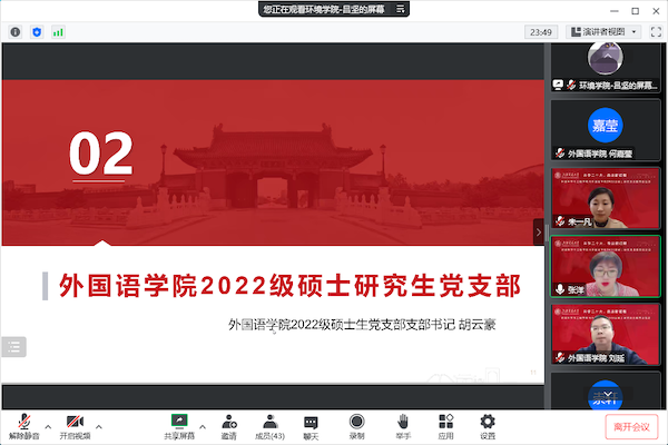 环境学院2022级硕士生党支部书记常崇轩和外国语学院2022级硕士生党支部书记胡云豪分别介绍了各自所在党支部构成、支部工作理念,以及围绕学习贯彻党的二十大精神开展的活动。
