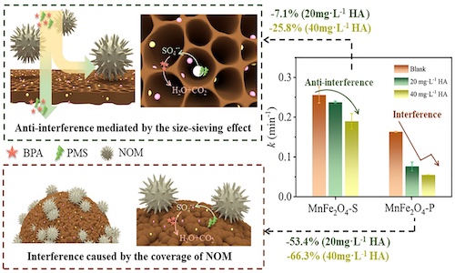 本文采用无溶剂熔融法制备了具有三维分层多孔结构的海绵状磁性锰基铁氧体(MnFe2O4-S)。与MnFe2O4-P的颗粒状结构相比,其结构上的变化有望提高活化剂降解活性,克服NOM干扰。采用MnFe2O4-S活化过一硫酸盐(PMS)来降解多种新型污染物,并将其与MnFe2O4-P在有无腐殖酸(HA)的条件下降解双酚A的能力进行比较。MnFe2O4-S的降解效率是MnFe2O4-P的1.6倍。此外,20 mg·L-1 HA对MnFe2O4-S降解活性的抑制作用仅为7.1%,远低于MnFe2O4-P的53.4%。MnFe2O4-S的抗干扰特性和高效的降解效果在多种水基质中也得到保持。特别在湖水基质中,MnFe2O4-P的降解活性被抑制了35.6%,而MnFe2O4-S的降解活性几乎没有受到抑制。这一成果为绿色合成具有抗环境干扰性能的高活性多孔尖晶石铁氧体提供了另一种途径。