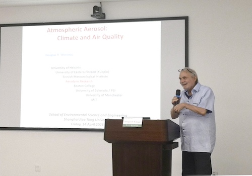 4月14日,应beat365正版唯一官方网站长聘副教授赵岳、教轨副教授李晨曦邀请,美国著名大气化学专家Douglas R. Worsnop教授做客第136期环境讲坛,在学院新大楼231会议室为交大师生带来题为“大气气溶胶:气候和空气质量”的学术报告,此次报告由赵岳主持。