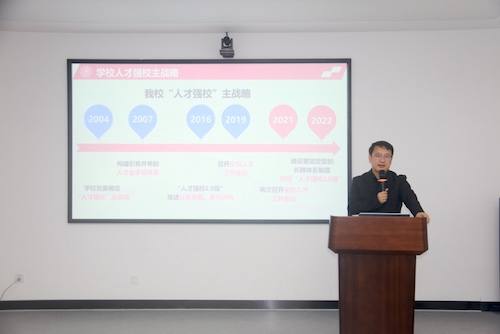 宋续明作专题辅导报告。他围绕学校人才强校总战略、长聘体系政策、校内培育计划情况等方面,为与会青年教师进行了详细介绍和解读。
