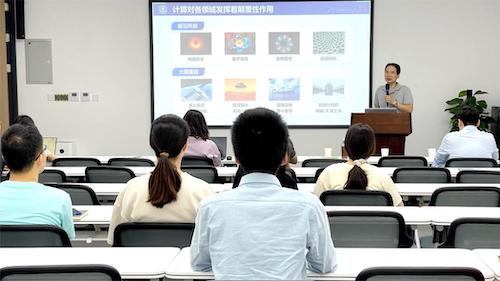 随后,“交我算”团队的苏小明老师介绍了计算平台的软硬件环境以及使用技巧,针对学院师生广泛关注的数据分析和AI计算需求,重点阐述了生成式AI和预训练大模型带来的新研究范式,以及由自动化、高通量和AI模型共同构成的干湿闭环的新研究模式。计算部主任文敏华老师结合多个不同学科的案例介绍了“交我算”的进阶使用,包括超声超分辨率微血管成像、ParaFold集群版、湍流燃烧程序等代码优化案例,以及世界最大规模的宇宙学N体模拟、人工智能辅助耳聋预警和预测、生信分析平台等学科融合案例。最后,“交我算”于潇雪老师介绍了“交我算”提供的教学支撑服务,包括如何在“交我算”平台为计算相关课程免费申请计算资源,以及“交我算”计算教学实践平台提供的课程定制服务等内容。