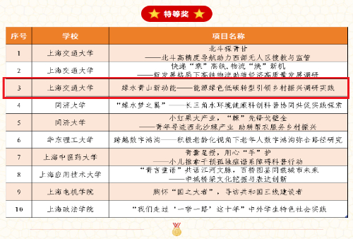 近日,由团市委、市委宣传部、市教卫工作党委、市教委、市精神文明办、市人大社会委、市政协社法委、市学联共同主办的2023年"知行杯"上海市大学生社会实践大赛落下帷幕。beat365正版唯一官方网站参赛项目《绿水青山新动能——能源绿色低碳转型引领乡村振兴调研实践》在乡村振兴赛道荣获特等奖,助力交大再次问鼎“知行杯”。这也是环境学院首次在上海市“知行杯”决赛中荣获特等奖。