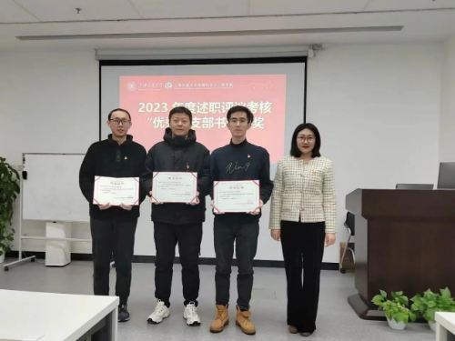 张洋为三位在2023年度党支部书记抓基层党建工作述职评议考核中获评“优秀”的学生党支部书记颁发荣誉证书,表彰他们在过去一年工作中的突出表现。
