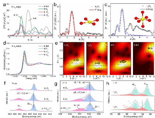 通过X射线光电子能谱(XPS)X射线吸收精细结构谱(EXAFS)及其拟合结果等多项表征,该团队证实了泡沫钛表面氧化层的结晶度会强烈影响Ir单原子的局部配位环境,并进一步影响周围的电子结构。为方便表述,根据EXAFS拟合结果将锚定在非晶钛氧化层上的Ir单原子电极记为Ir1O4,而锚定在晶体钛氧化层上的Ir单原子电极记为Ir1O6