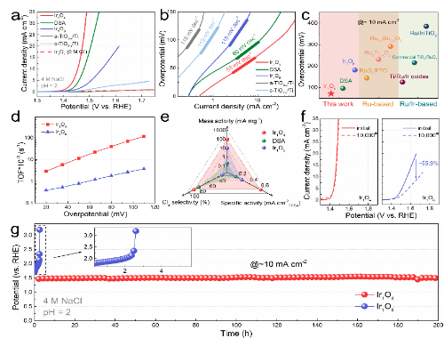 Ir1O4阳极展现出优异的CER活性和稳定性:仅需71.8 mV的过电位就达到10 mA cm-2,质量活性高达95 mA mgIr-1,这远远优于对应的Ir1O6阳极(181.4 mV, 9.35 mA mgIr–1)和商业DSA95.8 mV, 0.20 mA mgIr+Ru–1)以及大多数报道的Ru/IrCER电催化剂。同时该电极也展现出优异的稳定性,经过10000次循环扫描或连续工作200小时均未出现明显的活性衰减。