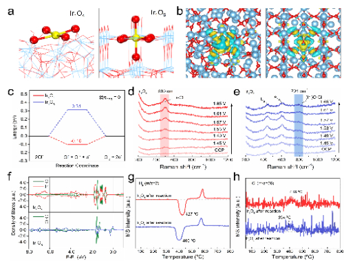 理论计算(DFT)结果和原位拉曼光谱(Raman)揭示了Ir单原子配位环境的差异对电极活性的影响机制。Ir1O4电极中配位不饱和的Ir是吸附Cl的活性中心,但在Ir1O6电极上则变成顶端配位的OIr1O4上更适中的Cl吸附能(更靠近0 eV)使得其更利于CERVolmer过程(*/O* + 2Cl → Cl*/ClO* + Cl + e)的发生,从而赋予其更优异的CER活性。