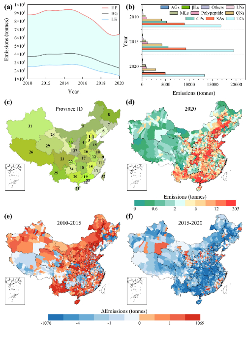 图1 兽用抗生素排放种类、时间趋势和空间格局