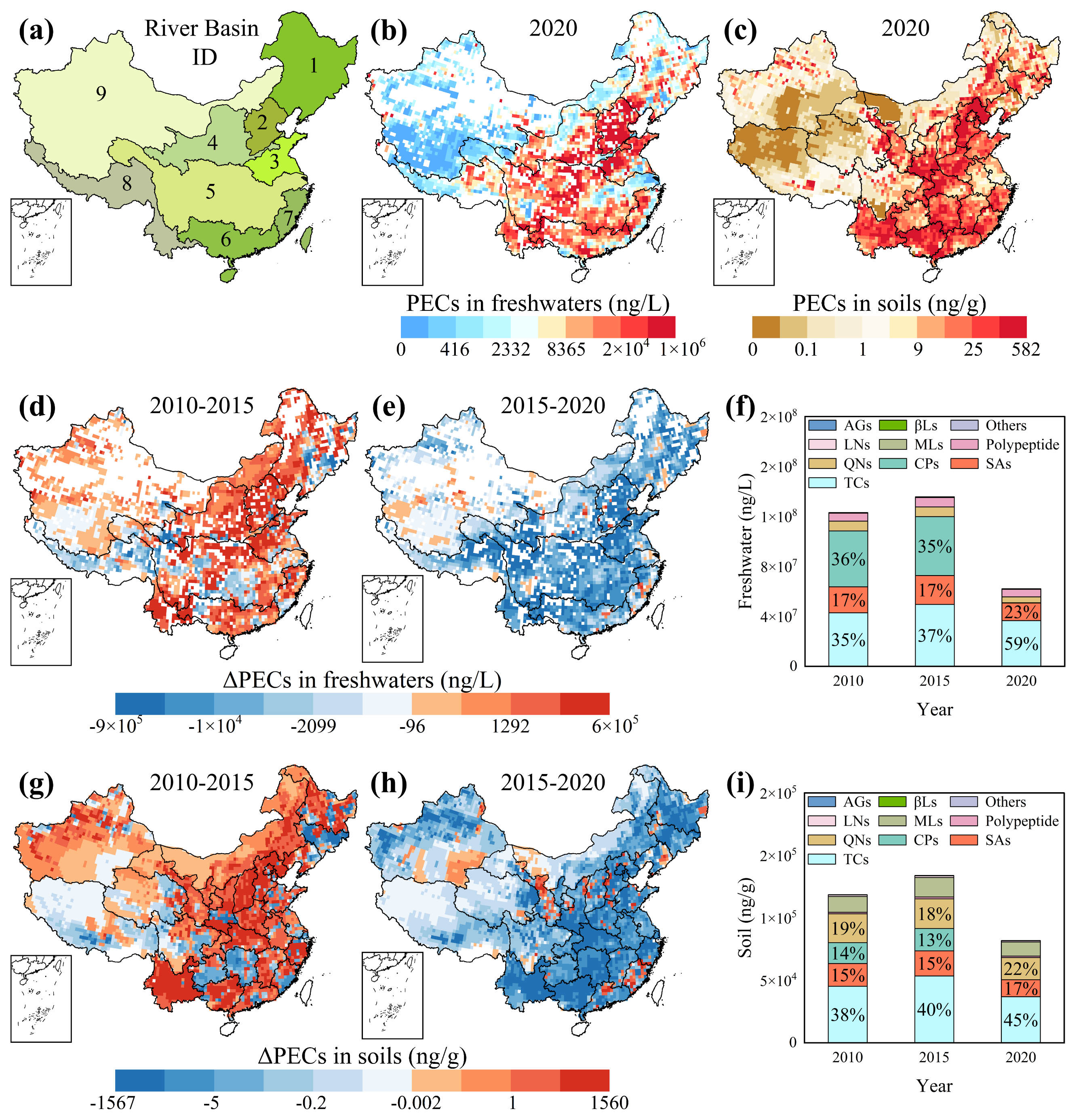 尽管只有约15%的兽用抗生素被排放到水体中,但造成的环境浓度并不低。研究表明,2020年地表水中的总抗生素浓度在海河流域(河北省境内)、淮河流域(河南省境内)和长江流域(河南省境内)高于其他地区(2,044-1.3×106、600-3.0×105和1.8×104-2.6×105 ng/L),而在西北内陆河流域、松花江-辽河流域和西南河流域地表水中的总抗生素浓度低于其他地区(0.30-8.4×105、0.01-2.4×105、和0-1.0×105 ng/L)。地表水浓度的地理格局与排放分布基本一致,但受环境参数(如地表水径流量稀释作用)的影响,存在区域不一致性。此外,河北、广西和河南的农业土壤总抗生素浓度高于其他地区,分别为11-582、0.74-360、和4.5-194 ng/g。四环素类、氯霉素类和磺胺类抗生素是地表水和土壤中的主要成分,其中四环素类的贡献最大,这与排放组成基本一致。