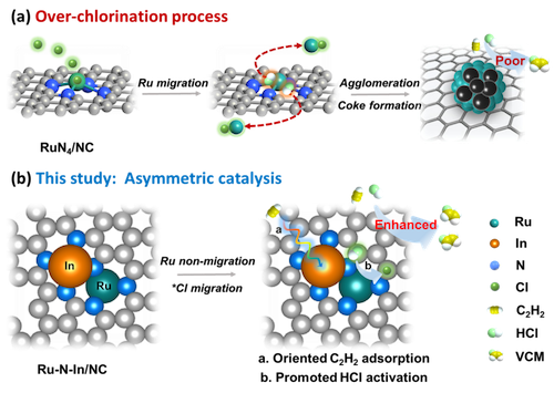 基于对Ru催化剂的前期研究基础,常用的对称RuN4/NC结构在乙炔氢氯化反应中存在严重的过度氯化问题,容易导致金属活性组分流失和积碳产生,能否打破几何RuN4/NC的对称性并构建独特的不对称构型,或许是解决该问题的关键。