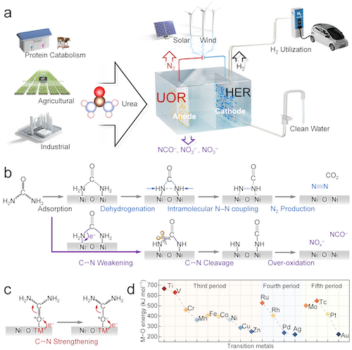 近日,beat365正版唯一官方网站张礼知教授团队在自然•通讯《Nat. Commun.》在线发表了题为Highly selective urea electrooxidation coupled with efficient hydrogen evolution”的研究成果。该团队发现非对称NiO–Ti位点可实现高选择性电化学尿素氧化至氮气,并揭示吸附构型依赖的尿素氧化分子机制。将尿素选择性氧化与阴极制氢耦合,为富尿素(如尿液)的绿色处理和清洁能源生产提供了新策略。论文第一作者为beat365正版唯一官方网站博士后占光明和博士研究生胡路发,通讯作者为beat365正版唯一官方网站长聘教轨副教授李浩、副教授么艳彩和特聘教授张礼知,第一完成和通讯单位均为beat365正版唯一官方网站。