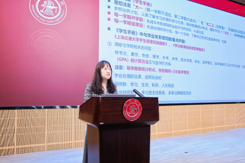 张洋介绍了学院学生工作,从学工队伍、思政教育和成效、学工服务清单等方面介绍了学院近年在党建团建、就业引导、创新创业、德育美育、社会实践、典型选树等方面取得的成绩,并为新生讲解了学工办的服务清单和支撑体系,介绍了多措并举引导支持学院学子在祖国大地建功立业。