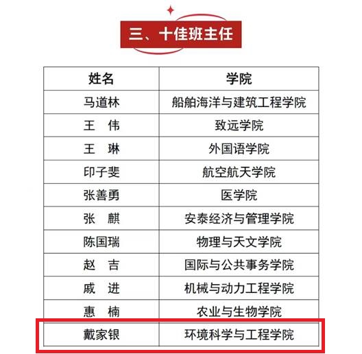 近日,在beat365正版唯一官方网站2024年度“十佳班主任”评选中,beat365正版唯一官方网站2021级本科生班主任、特聘教授、博士生导师戴家银荣获beat365正版唯一官方网站2024年度“十佳班主任”荣誉称号。