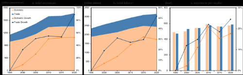 2000年至2020年间,美国是通过贸易净进口高温暴露最多的国家,其净高温暴露从1995年的292亿人·小时增长到2020年的732亿人·小时。中国的净高温暴露出口显著减少,从1995年作为最大出口国(307亿人·小时)降至2020年的仅3亿人·小时。2020年,印度成为最大的净高温暴露出口国(466亿人·小时),紧随其后的是越南、印尼、孟加拉国和埃塞俄比亚。在过去三十年中,越来越多的发展中经济体的高温暴露有所增加,这意味着其劳动者需要承受更多气候变化引起的公共健康后果。(图4)
