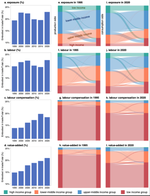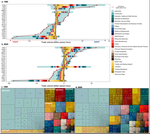气候变化导致更多地区面临极端热浪,暴露在高温条件下的人口大幅增加,对全球劳动力构成了重大威胁,尤其是生活在最贫穷和最炎热地区的劳动者。这些地区的劳动力因低劳动成本获得了新的就业机会,但同时面临前所未有的职业高温暴露风险。尽管现有研究在量化高温暴露、估算高温相关劳动生产率和死亡率等方面取得了重要进展,但尚不清楚国际贸易如何影响全球劳动力的高温暴露分布,以及贸易如何塑造全球产业链中不同位置国家的脆弱性。因此,亟需评估不同国家的劳动者在高温下的脆弱性,厘清其生产活动和在国际贸易中的角色如何塑造了这种脆弱性,而其消费又如何引起了其他国家劳动者的高温暴露。