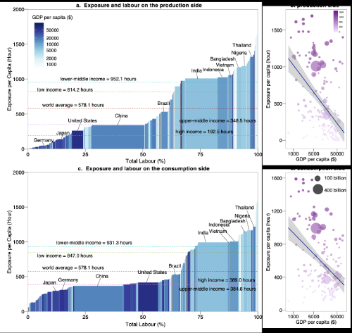 极端高温暴露在各国间存在显著的不平等。发展中经济体在生产活动中面临显著更高的暴露风险,其劳动者极易受到高温的影响。富裕经济体的人均高温暴露工作小时数显著低于发展中经济体,尤其是东南亚和非洲地区的暴露率最高。而消费端暴露的分布与生产端暴露相比有所不同。高收入组的消费端人均暴露是其生产端人均暴露的两倍,表明他们应承担更高的相关环境成本。人均净暴露率(即基于消费的暴露足迹与基于生产的暴露之差)在富裕经济体中为正,但在发展中经济体中为负,表明发达经济体通过国际贸易将其环境负担外包给了发展中经济体。这种差异与社会经济特征密切相关,例如经济发展水平、产业结构、平均劳动工作时间和贸易模式。