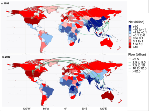 图4 1995年和2020年隐含于贸易的主要暴露流