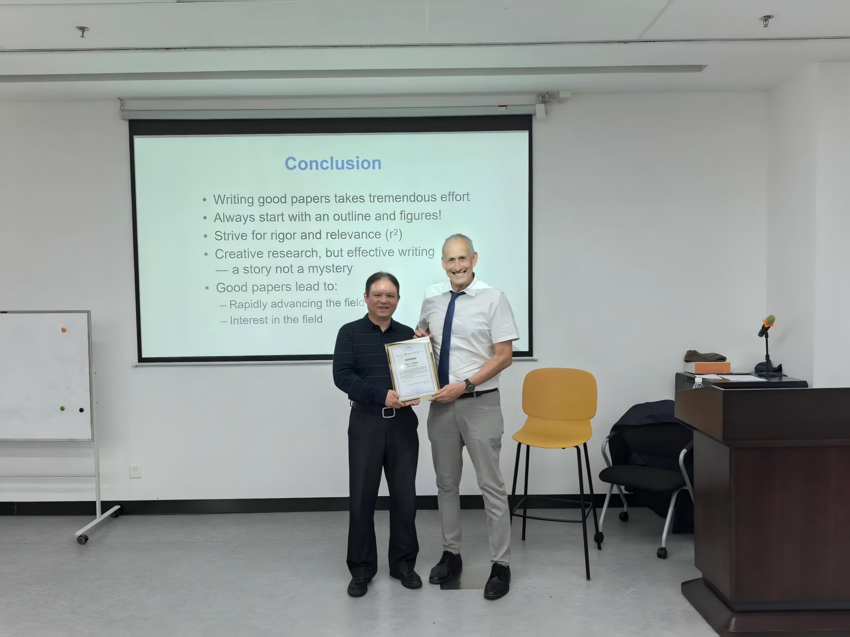 讲座最后,龙明策代表学院为Alvarez教授颁发了环境讲坛纪念证书并合影留念。