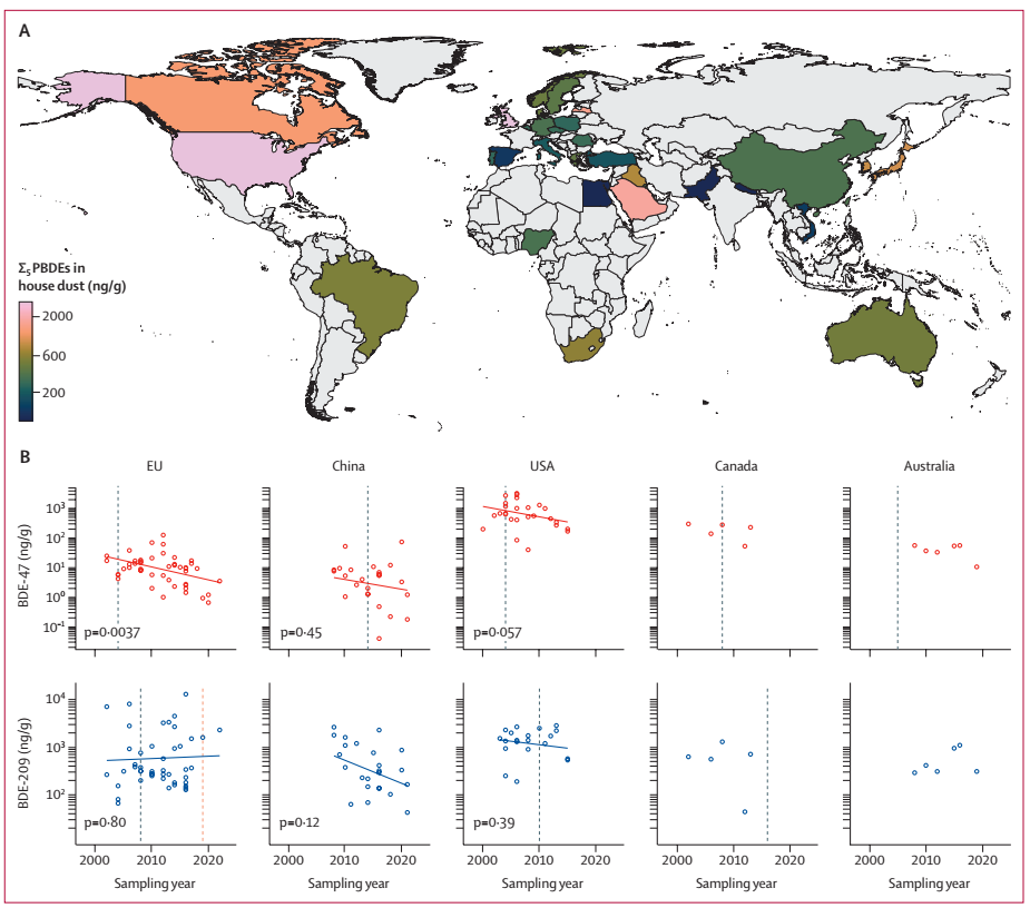 有机添加剂被广泛应用于各类消费品中,它们通常以物理形式被掺入,因此会在产品的整个生命周期内持续释放到环境中。这些添加剂中,许多具有持久性、生物累积性和毒性(PBT)特征,对人类健康构成潜在风险。《斯德哥尔摩公约》所列管的持久性有机污染物(POPs)中,有近一半曾被用作商业添加剂。多溴联苯醚(PBDEs)是其中的典型代表,作为一类广泛应用的阻燃剂,自21世纪初起因其健康风险被全球大部分国家逐步禁用。要科学评估这些政策禁令的有效性,需要将其监管时间表与污染物在外暴露和内暴露水平上的时间趋势进行关联。室内灰尘构成了连接环境与人体的关键枢纽。它既能反映PBDEs的源排放趋势,也是人体外暴露的主要途径。本研究通过对全球数十年监测数据进行荟萃分析,旨在通过系统分析国际禁令颁布前后,PBDEs在室内灰尘(外暴露介质)与人体生物样本(内暴露水平,包括血清和母乳)中的浓度趋势,以评估全球化学品管制政策的真实成效、潜在滞后性及其面临的挑战。