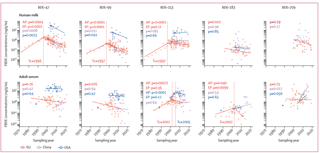 图3 欧盟、中国和美国人体内(成人血清和母乳)的PBDE的时间变化趋势