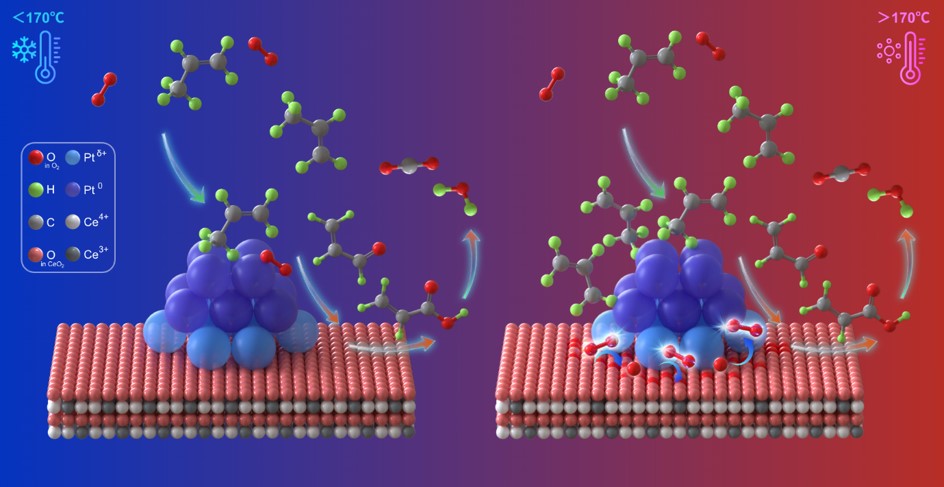 C3H6作为活性较高的烯烃类挥发性有机物(VOCs),在大气光化学过程中对臭氧(O3)生成具有重要作用,同时其氧化产物也可贡献一定量的二次有机气溶胶(SOA)。丙烯催化氧化是机动车尾气污染控制中的关键反应之一,Pt/CeO2催化剂因其高活性和氧存储能力而备受关注。然而,长期以来,Pt/CeO2催化剂的反应活性位点以及温度对反应机制的影响存在争议。本研究通过简单的氢活化处理,成功构建了金属Pt团簇活性位点,使50%丙烯氧化转化率的反应温度(T50)降低了120 °C。研究进一步确认了丙烯氧化的动态催化反应路径,即低温下双分子吸附,高温下界面活化主导。结合多种原位表征技术和理论计算,研究发现反应路径在170 °C附近存在一个阈值温度:低温时丙烯氧化遵循经典的Langmuir-Hinshelwood模型,而高温时O2活化位点从Pt团簇表面迁移到Pt-O-Ce界面,这一动态转变机制为理解催化剂在真实工况下的催化反应行为提供了新视角。
