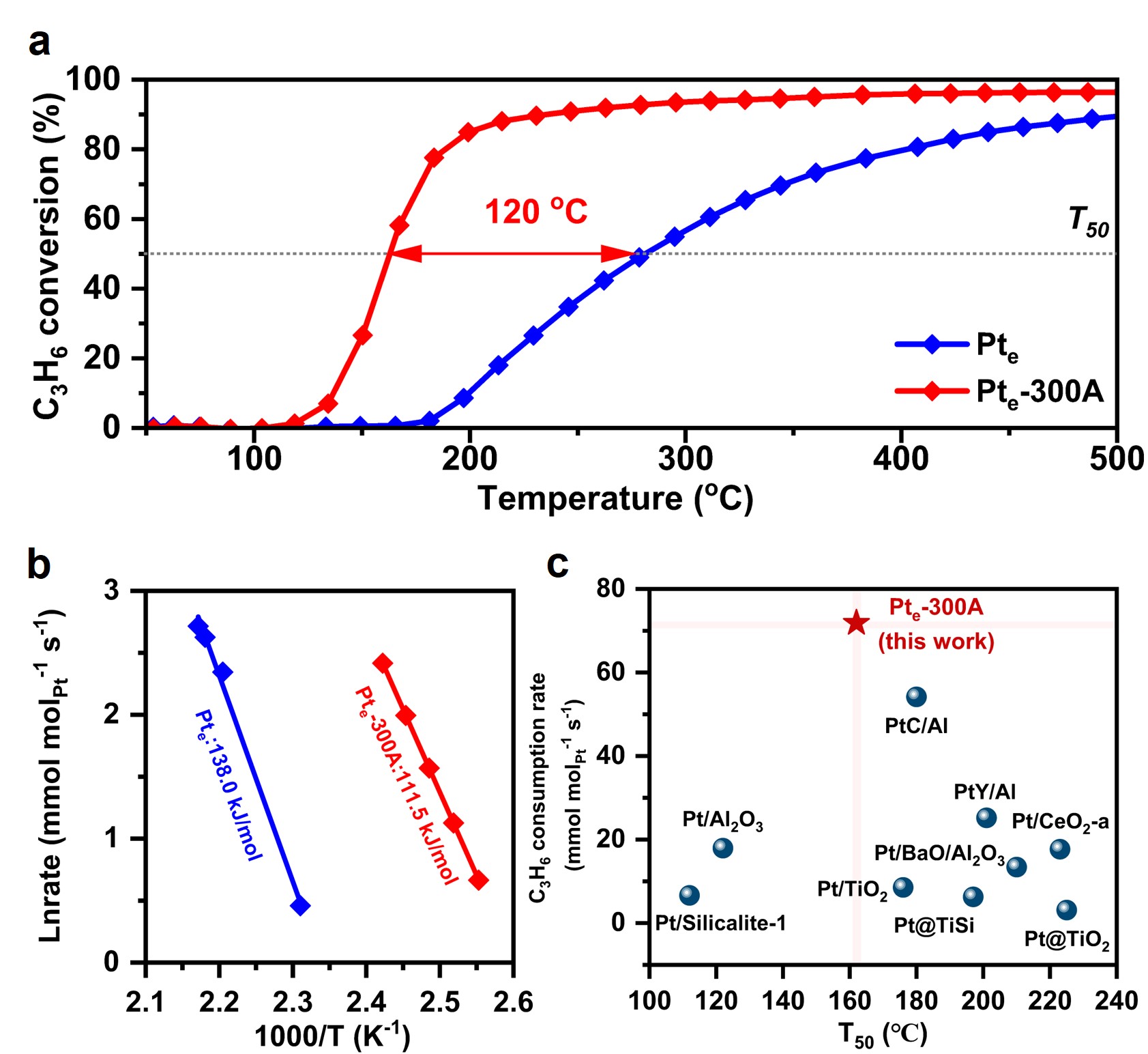 图1. 负载型Pt催化剂上C3H6氧化的催化活性与表观活化能。a C3H6氧化起燃曲线。反应条件:1000 ppm C3H6,10% O2,N2平衡气,质量空速(WHSV)为240,000 mL g⁻¹ h⁻¹;b C3H6氧化的阿伦纽斯曲线;c Pte-300A催化剂与文献报道的Pt催化剂在C3H6氧化反应活性的对比。