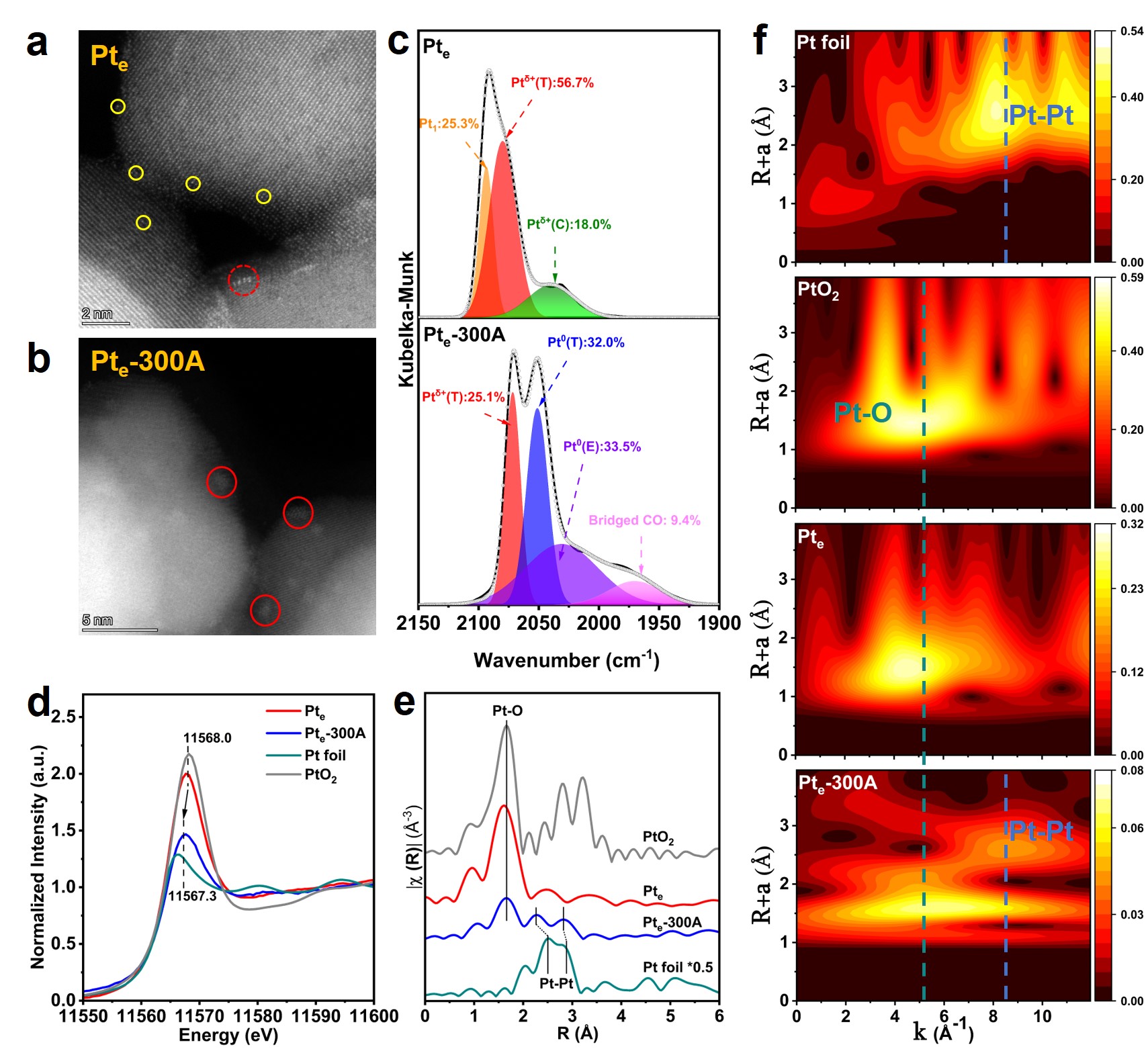 图2. Pte和Pte-300A催化剂的结构表征与活性位点确认。(a,b)Pte和Pte-300A的HAADF-STEM图像(黄色圆圈:Pt单原子;红色虚线圆圈:平面单层Pt团簇;红色实线圆圈:多层Pt团簇);(c)Pte和Pte-300A在30 ℃下CO吸附的原位DRIFTS光谱;(d)Pte和Pte-300A的归一化Pt L3边XANES谱;(e)Pte和Pte-300A在R空间中的傅里叶变换k2加权EXAFS谱;(f)Pt箔、PtO2、Pte和Pte-300A样品的Pt L3边EXAFS小波变换图。