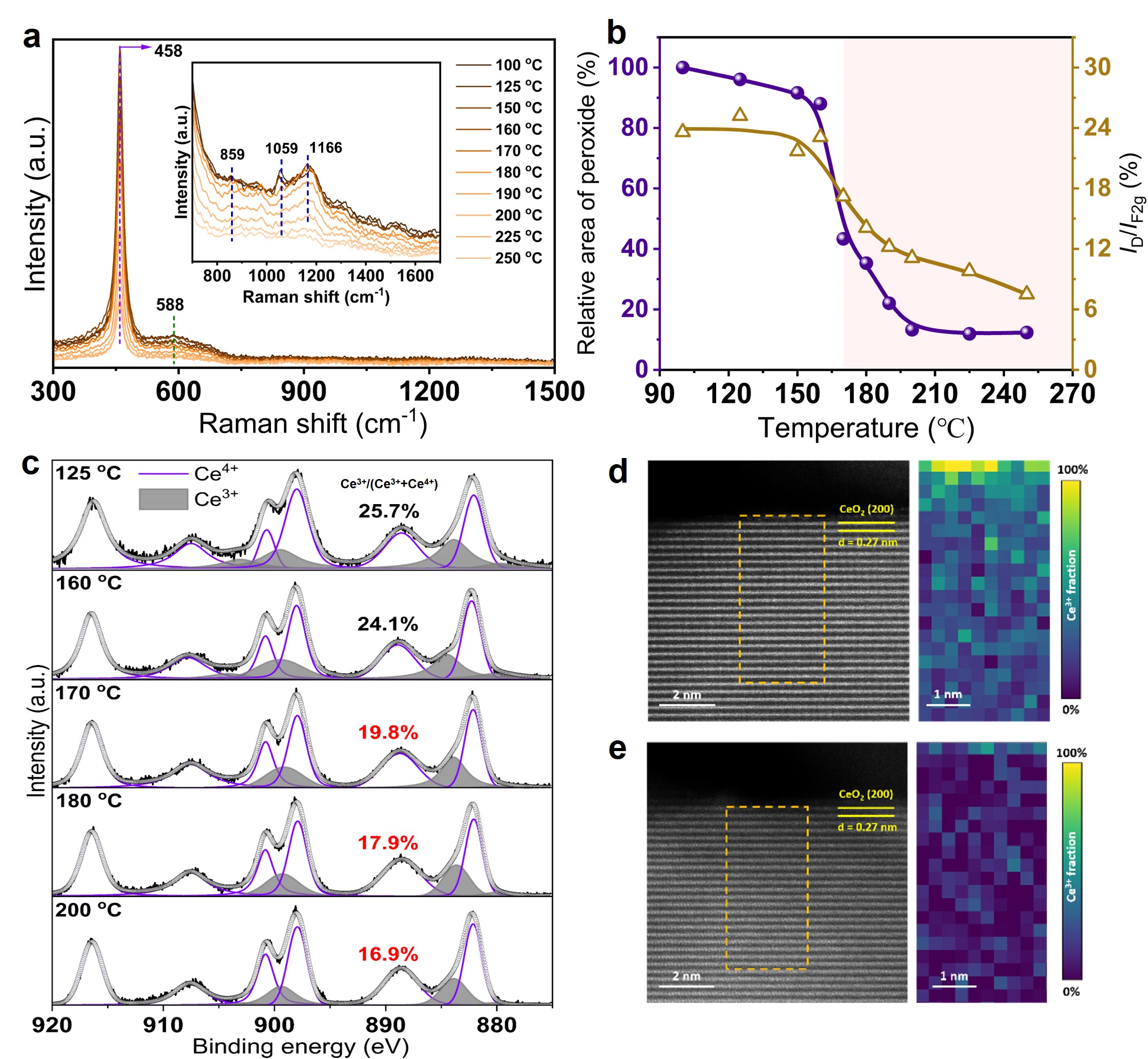 图3. Pte-300A催化剂在C3H6氧化过程中的动态变化。(a)Pte-300A催化剂上100至250 ℃温度区间内C3H6氧化的原位拉曼光谱;(b)100至225 ℃温度范围内过氧化物比例与缺陷峰强度比(ID/IF2g)的变化趋势;(c)不同温度下Ce 3d轨道的近常压X射线光电子能谱(NAP-XPS);(d)和(e)分别为Pte-300A在162 ℃和188 ℃反应后的电子能量损失谱(EELS)分析结果。