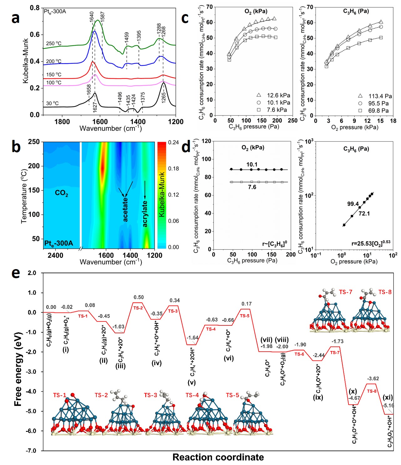 图4. Pte-300A催化剂上C3H6氧化反应机理与表面中间体的研究。(a)C3H6与O2稳态共吸附反应的原位DRIFTS光谱;(b)C3H6氧化的二维等高线图;(c)和(d)分别展示了162 ℃和188 ℃条件下C3H6与O2分压对Pte-300A催化剂上C3H6消耗速率的影响;(e)DFT计算获得的C3H6氧化反应机理与反应能垒,包括详细过渡态和自由能变化。