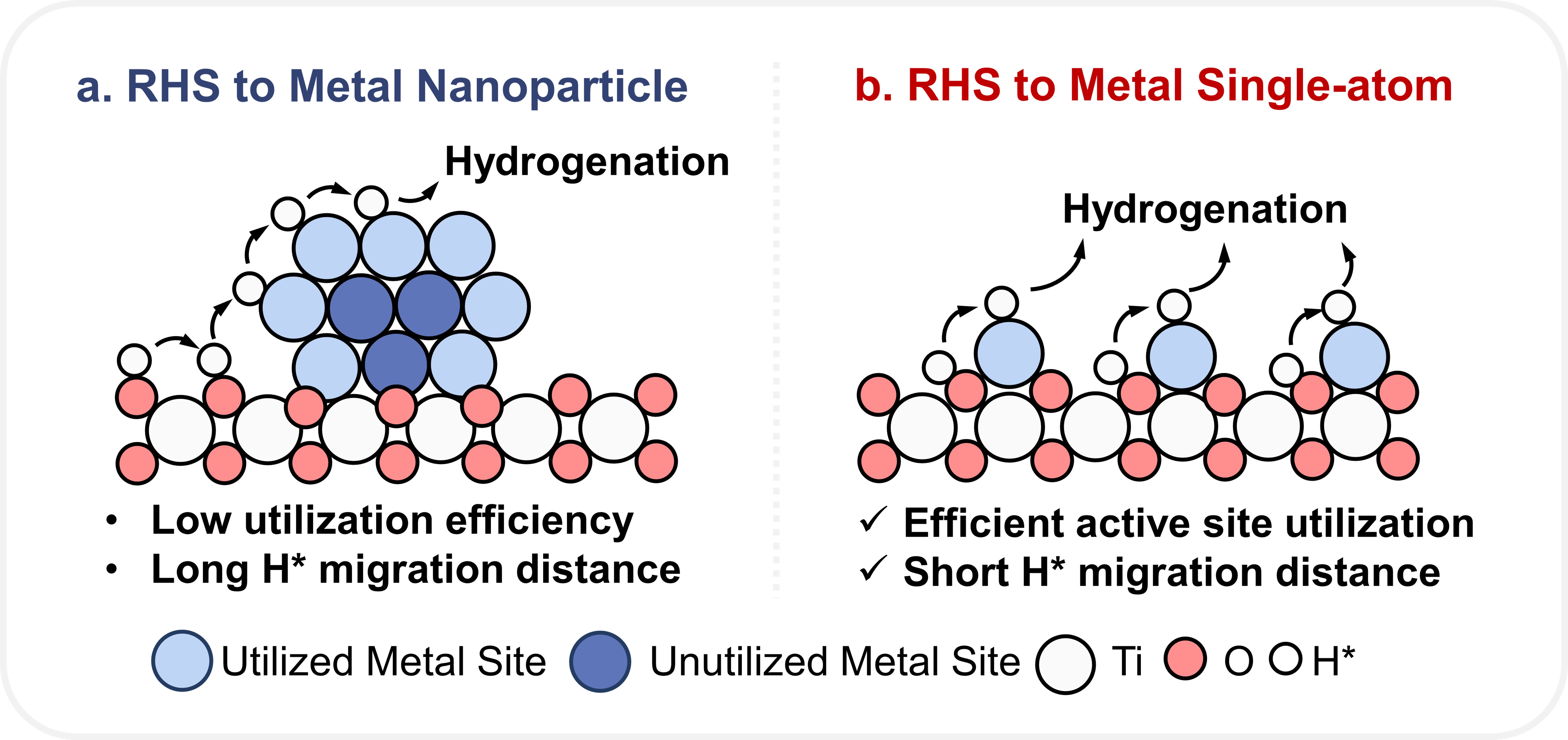 反向氢溢流(RHS)作为电化学加氢反应中的关键步骤,在能源存储、化学合成及环境修复等领域展现出变革性的潜力。传统的RHS电催化剂通常由具备优异水解离能力的可还原金属氧化物载体(如 TiO2、WO3)和发生催化反应的金属纳米颗粒活性中心组成。其通过在低过电位下产生还原性原子氢物种(H*),并定向传递至催化活性中心以完成目标反应过程(图1a)。