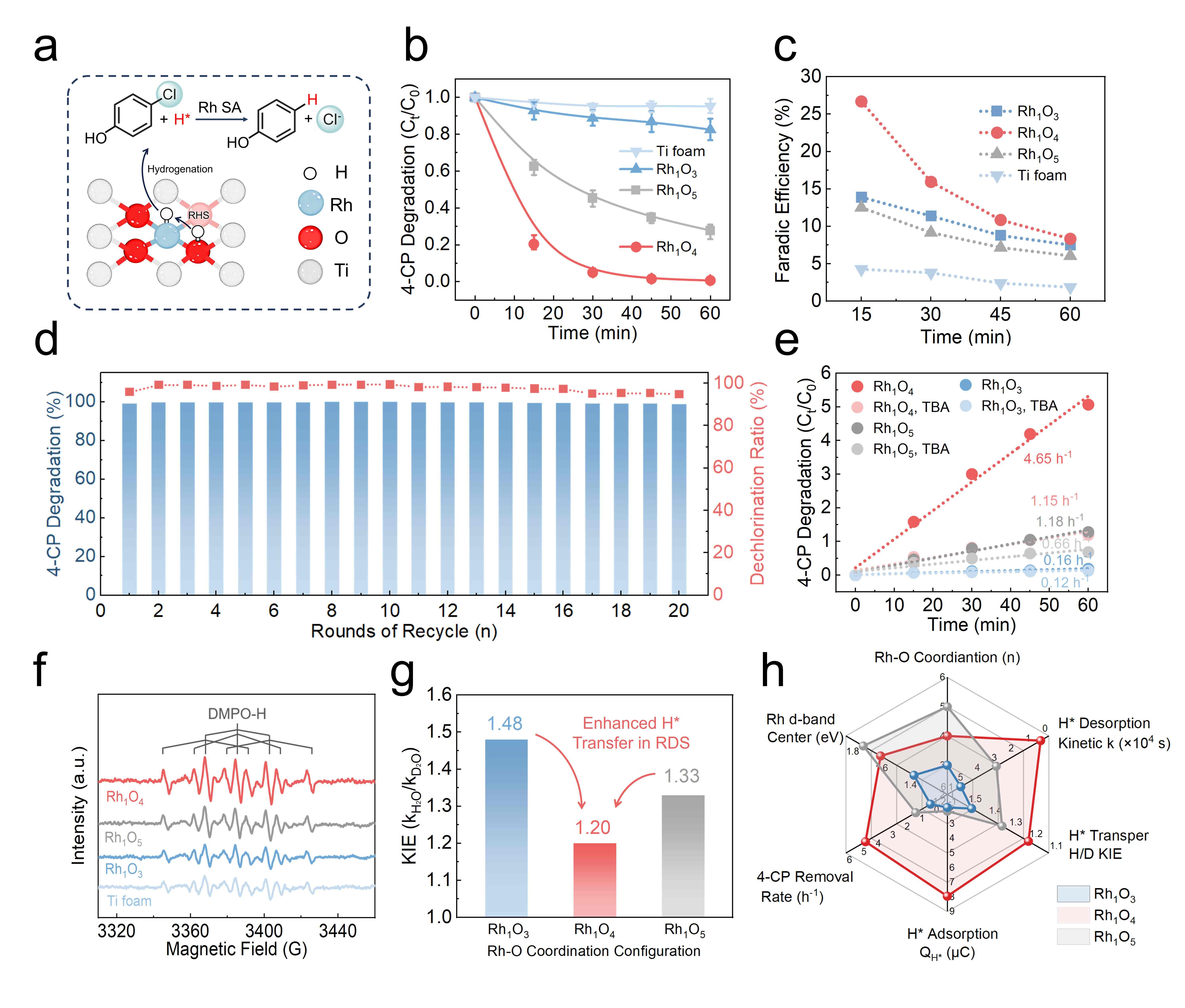 使用对氯苯酚(4-CP)作为模型污染物,测试了Rh1O4及其对照样的电化学脱氯性能(图5)。在 -0.6 V vs Hg/HgO的电位条件下,Rh1O4的4-CP还原比例在45 min内达到99%以上,超越Rh1O3(1h,18%)、Rh1O5(1h,72%)以及大多数报道的电催化剂。相较其他对照样,Rh1O4还表现出最高的法拉第效率,并在20轮稳定性测试中还原比例保持95%以上,展现出良好的实际应用前景。EPR、叔丁醇猝灭实验、H/D动力学同位素实验等一系列机理研究证明H*在Rh1O4的4-CP还原过程中起到关键作用,以及Rh1O4上加速的反向氢溢流现象显著促进了还原脱氯反应的进行。