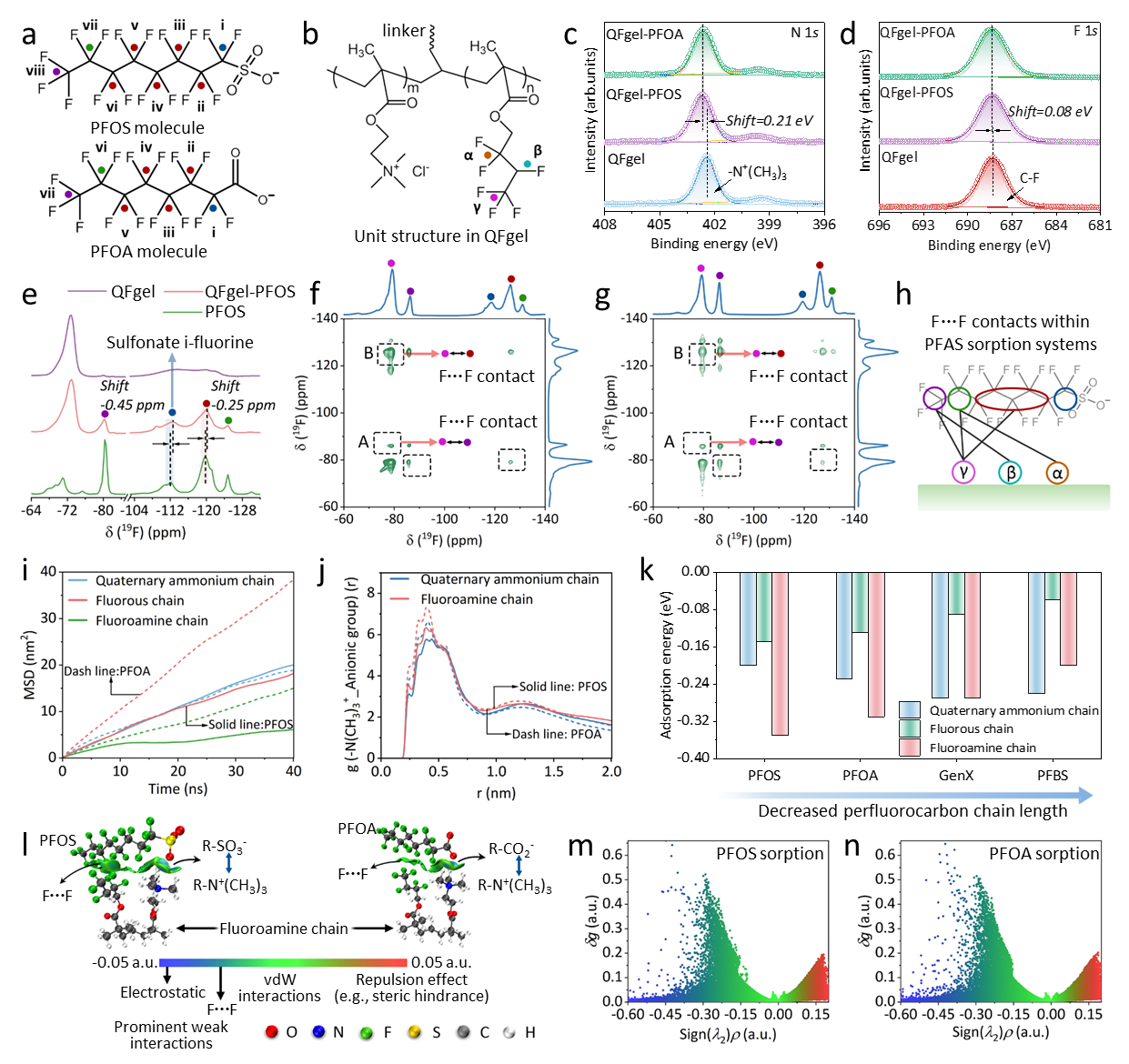 团队通过XPS、二维NMR、DFT计算等多种技术,在分子层面揭开了QFgel高效吸附的奥秘:静电作用是“主力抓手”:季铵盐基团的正电荷与PFAS阴离子头部形成强静电吸引,XPS 检测到吸附后季铵氮峰发生明显位移,证实两者紧密结合;亲氟作用是“精准锁钥”:2D NOESY 谱清晰捕捉到QFgel中氟原子与PFAS氟碳链的近距离相互作用(F-F接触),这种匹配性让材料在复杂体系中仍能选择性捕获PFAS;双位点协同增效:DFT计算表明,静电与氟亲作用的协同让PFAS吸附能低至- 0.35 eV,形成稳定的吸附复合物,而单一功能位点无法实现这种高效结合。