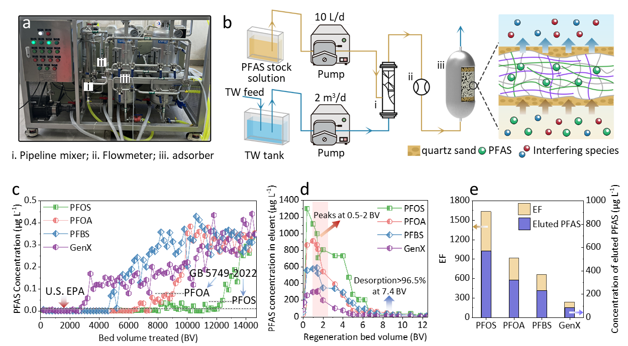 此外,基于氟胺凝胶的PFAS去除技术具备规模化应用潜力,包括(1)已实现公斤级量产。通过一步温和反应即可制备,量产产品的结构与性能和实验室样品一致,成本可控;(2)撬装式处理设备。基于QFgel的pilot级移动式水处理系统,日处理PFAS污染水达2吨,在符合中国饮用水标准(GB 5749-2022)下,PFOS 和 PFOA 的处理床体积分别高达12400BV和9215BV,并且仅需7.4BV脱附剂即可实现填充柱完全再生;(3)闭环处理更环保。再生过程可将 PFAS 富集1633倍,既降低处理成本,又为后续PFAS降解创造条件,避免二次污染。