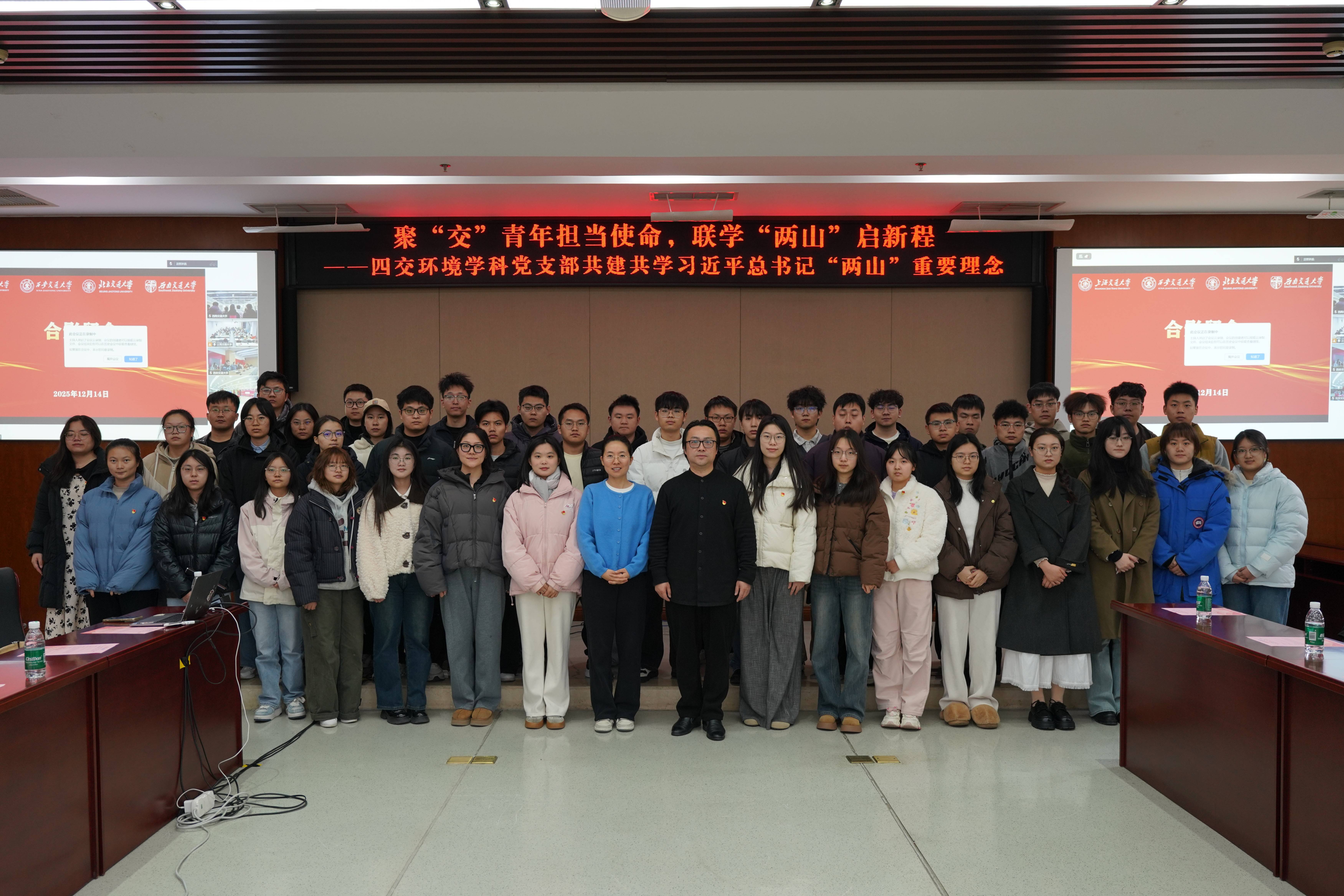 为迎接交通大学建校130周年华诞,同时纪念“两山”理念提出20周年,beat365正版唯一官方网站、西安交通大学、西南交通大学和北京交通大学四所同根同源的兄弟院校环境学科相关学院13个学生党支部于12月14日携手开展了“聚‘交’青年担使命,联学‘两山’启新程”线上联合主题党日活动,以思想共振凝聚行动合力,以红色传承呼应时代征程,共同书写服务国家生态文明建设与高质量发展的交大篇章。此次主题党日活动由上海交大环境学院2025级博士生党支部发起。