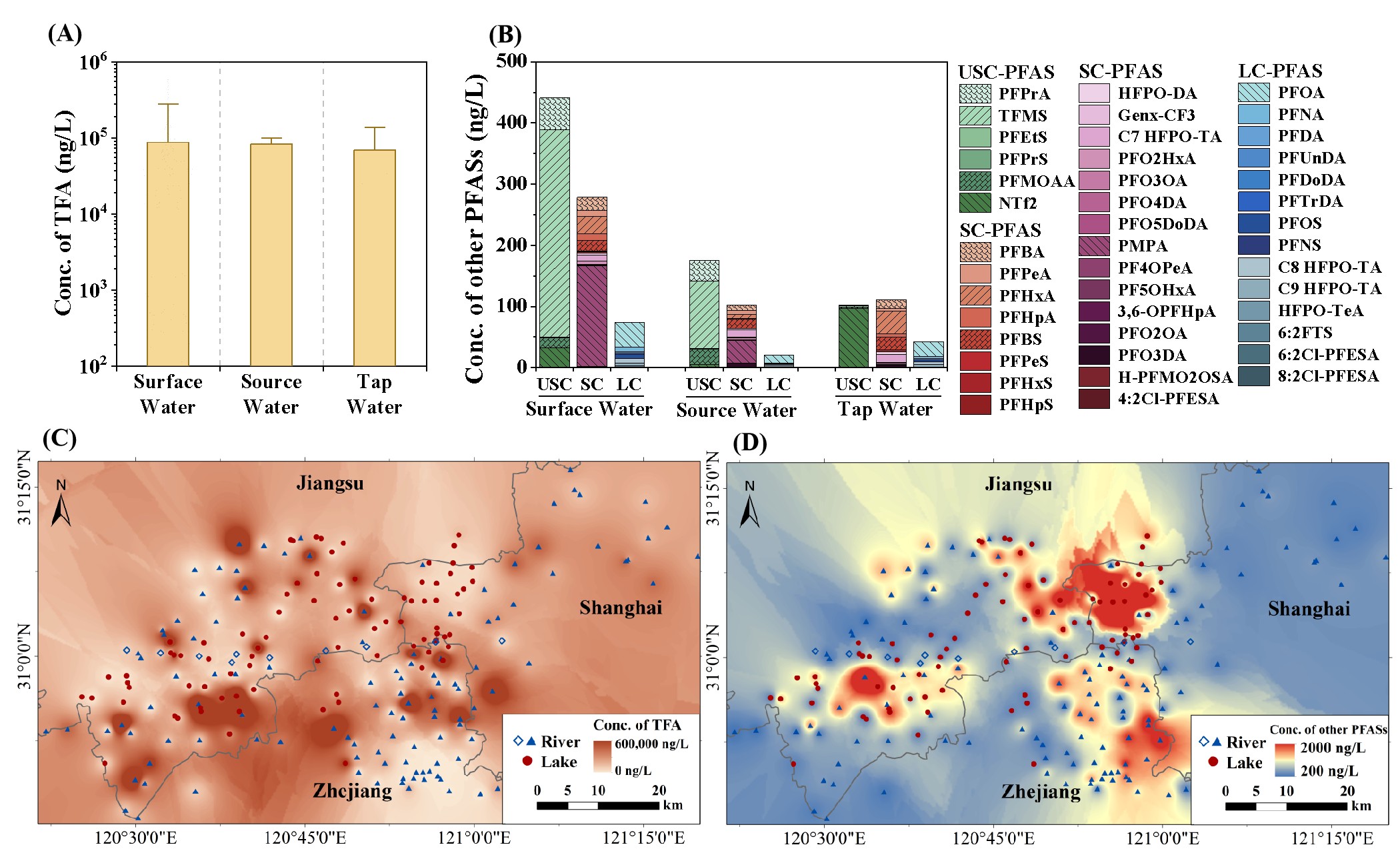 本工作首次系统解析了长江三角洲一体化示范区水体中USC-PFAS的环境行为与风险特征(图2)。研究在地表水、水源水和自来水中分别检出444134PFAS,其中TFA以绝对优势主导污染负荷——其平均浓度高达6.89×10⁴–8.7×10⁴ ng/L,超其他PFAS 2–6个数量级,占总44PFAS90.1%–99.6%。尤为关键的是,即使剔除TFA,其余6USC-PFAS仍贡献剩余污染物的40.0%58.8%,证实USC-PFAS已经成为区域PFAS污染的主体。