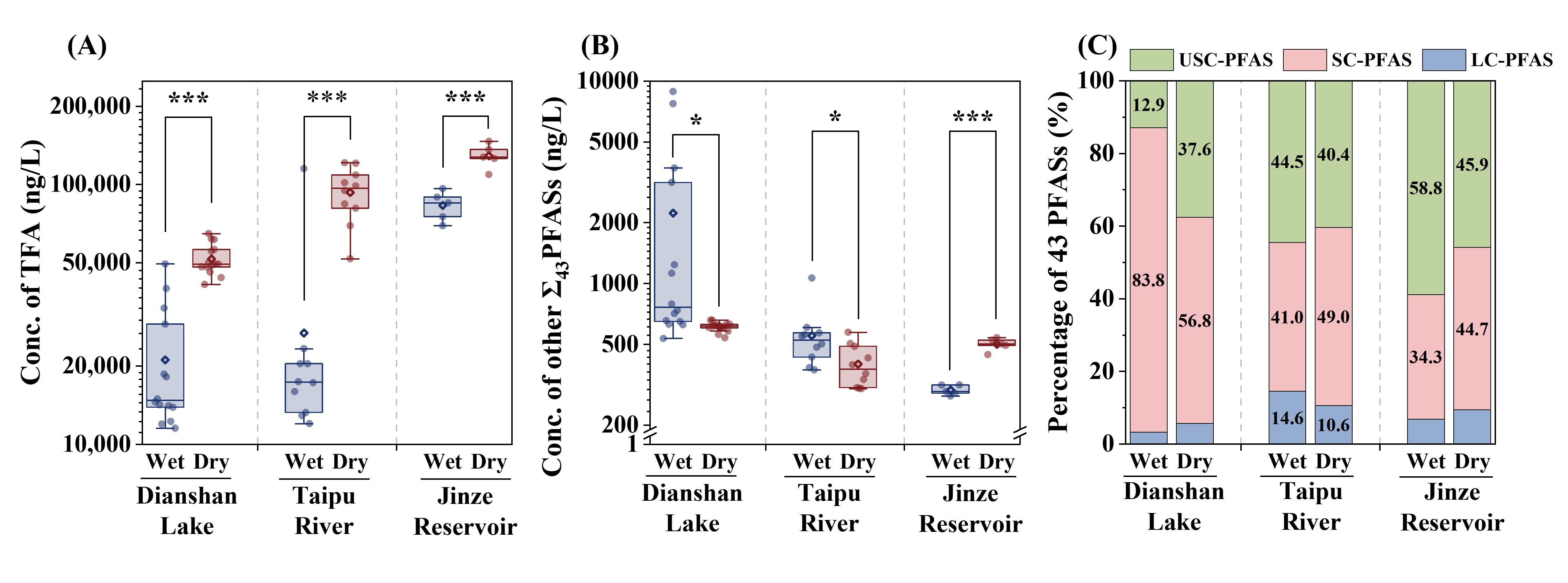 全氟多氟烷基化合物PFAS)因其优异的疏水疏油性和热稳定性被广泛应用于工业和消费品中,但其环境持久性、高迁移性和潜在毒性引发了全球关注。传统研究多聚焦于长链和短链PFAS,而碳链长度 ≤ 3的超短链PFASUSC-PFAS)的风险认知尚存局限。近年来,USC-PFAS在全球水体中频繁检出,其中三氟乙酸(TFA)浓度常高出其他PFAS几个数量级,暗示其可能已成为区域乃至全球水环境中不可忽视的新兴主导污染物。然而,目前对USC-PFAS的污染特征、来源解析、时空动态及其健康风险仍缺乏系统认知,尤其在快速城市化与工业化交织的敏感区域。