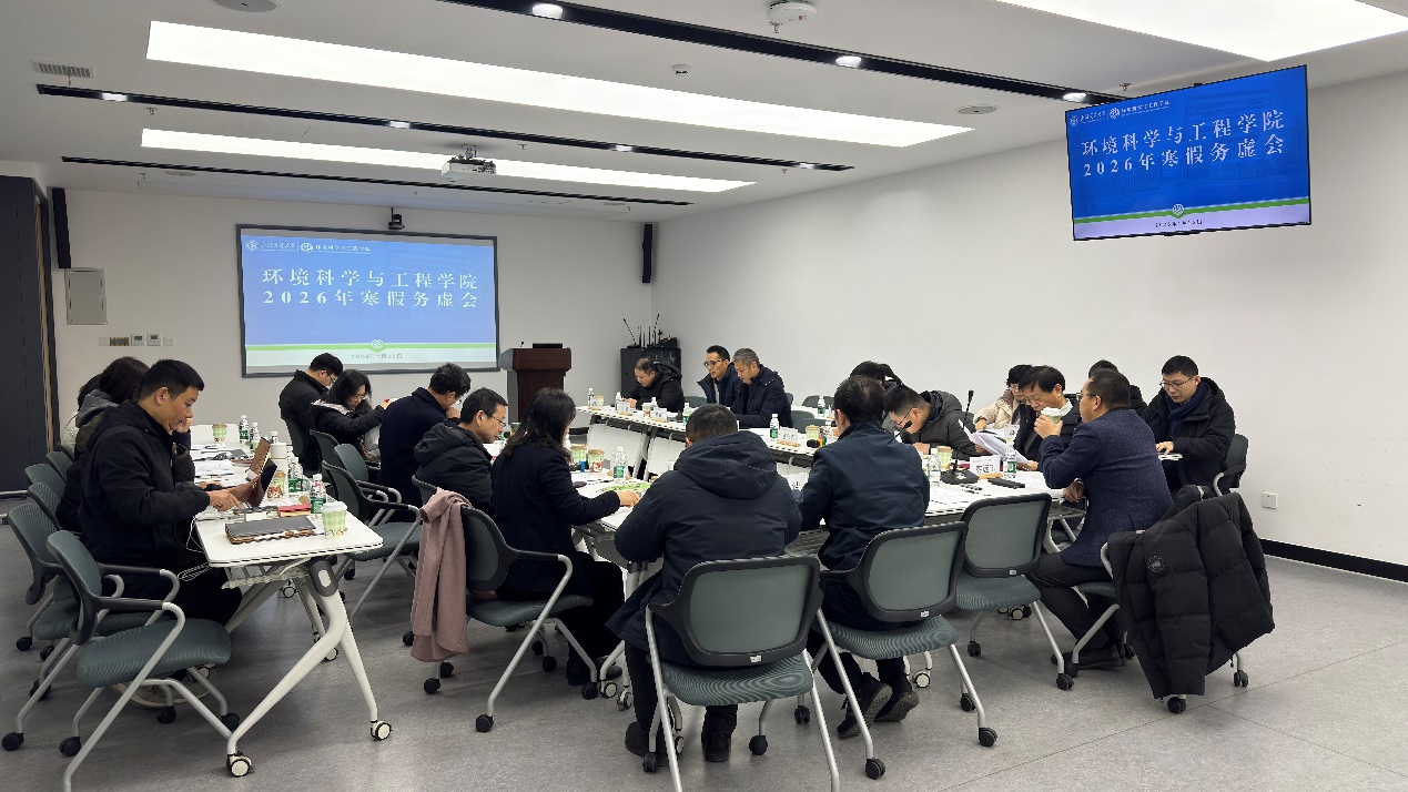 1月22日,环境学院2026年寒假务虚会在绿色环境楼231会议室举行。学校科研院学术发展与成果处副处长叶定剑、材料学院副院长韩远飞应邀参会。环境学院党委书记郑浩、院长于云江,全体领导班子成员、各系主任、党支部书记、科室(中心)主任及教师代表30余人出席会议。会议由郑浩主持。