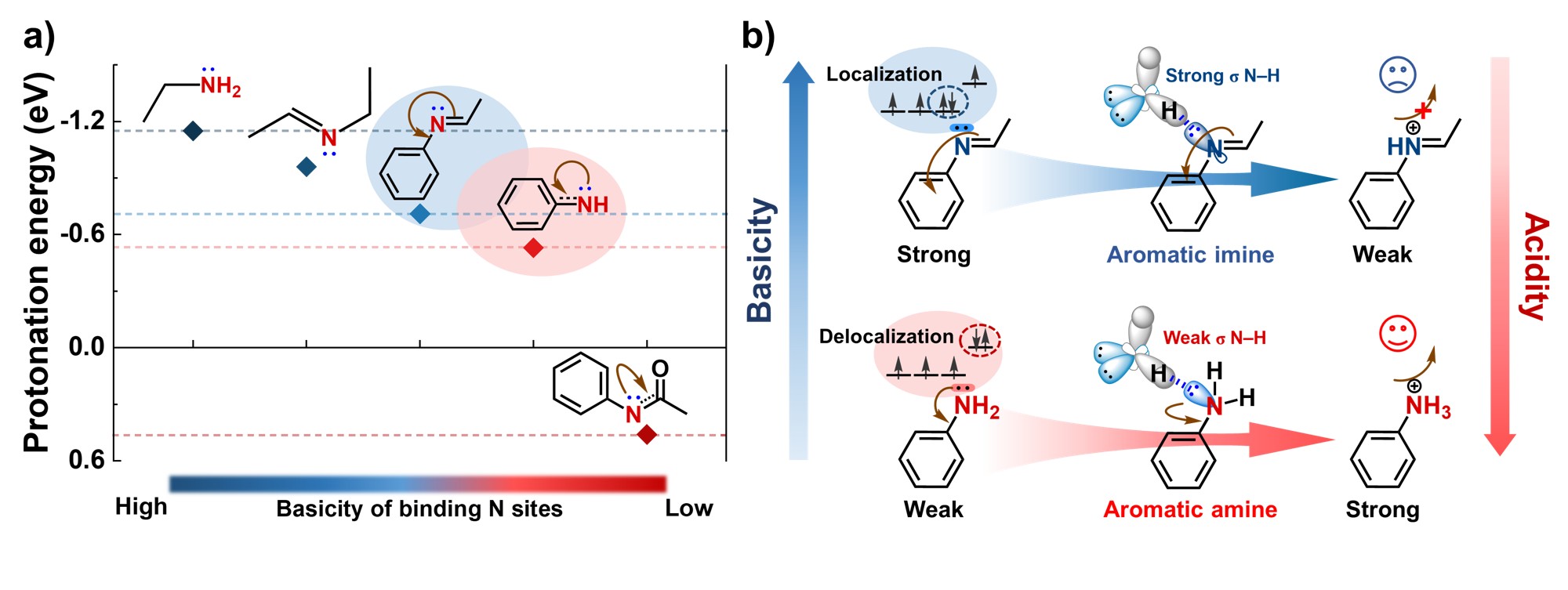 传统强碱性氮位点虽能通过质子化高效分解吸附态的水分子,但其质子化结构在热力学上难以去质子化,因而无法持续供给质子。为此,本文提出了“动态质子化”策略,在醌基共价有机框架材料(Q-COFs)中引入芳香化氨基官能团,通过平衡其质子化和去质子化过程,实现高效的质子生成与利用(图1)。因此,Q-COF(TfpBQ)通过快速的界面质子耦合电子转移实现了高效的醌氧化还原和双氧水合成。最终,TfpBQ在中性电解液中表现出最高的醌氧化还原表观速率常数(kapp=1.97×104 s-1),比不含芳香氨基官能团的Q-COFs高出43-92%。在120 mA·cm-2电流密度条件下,TfpBQ实现了19.3 mol·g-1·h-1的中性双氧水生成,法拉第效率(FE)达到95.6%,性能优于目前报道的多数非金属和金属电催化材料。