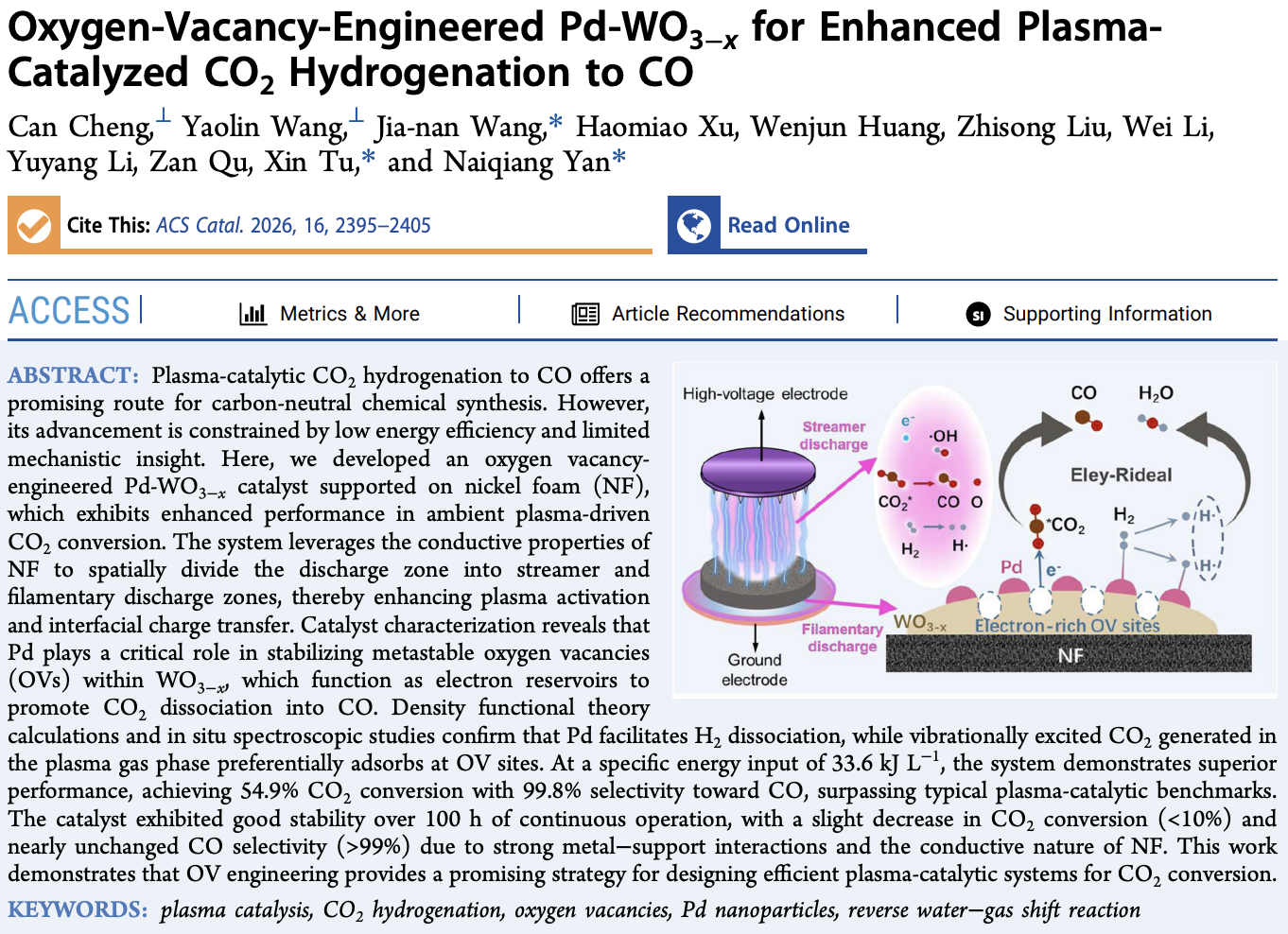 近日,beat365正版唯一官方网站晏乃强教授团队与英国利物浦大学屠昕教授团队合作在ACS Catalysis在线发表了题为“Oxygen-Vacancy-Engineered Pd-WO3-x for Enhanced Plasma-Catalyzed CO2 Hydrogenation to CO”的研究成果。