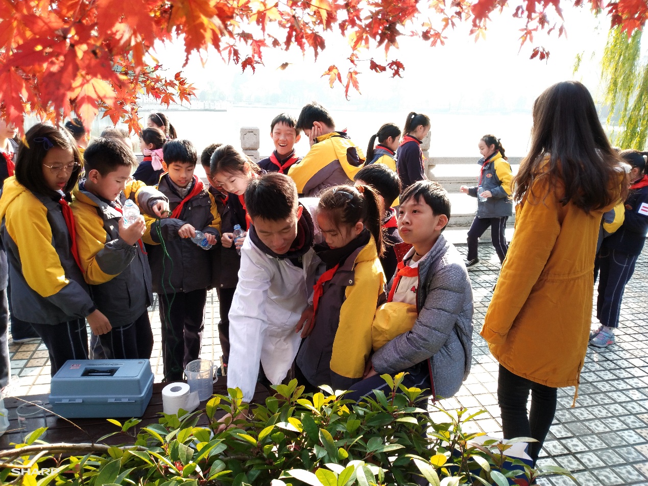 在校园中区,同学们围绕景观水体的水质调查体验了环保小卫士的工作。在大学生志愿者们的带领下,师生们对捭阖塘(荷花塘)、涵泽湖、交大二号河三个景观水体的水质进行了仔细观察和水样采集,并在王红艳、陶燕妍老师及志愿者们的帮助下对水样的浊度和溶解氧进行了现场测定和水质分析。