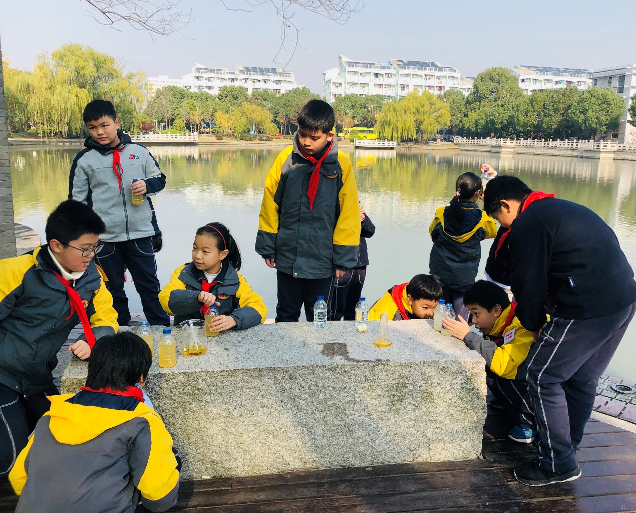 体验完环保小卫士的水质调查工作后,同学们前往涵泽湖畔的唯实亭开展当天的最后一个实验——神奇的絮凝剂及絮凝现象。在实验开始前,志愿者们对絮凝沉淀在水处理中的作用原理及意义作了简要介绍,开展了如何将水中的细颗粒物或胶体物质去除的实验。各小组同学在盛有浑浊液的矿泉水瓶中加入不同数量的氯化高铁絮凝剂,充分摇晃后,将实验瓶静置在阳光下进行观察。当看到絮凝体的出现和变大,同学们兴奋不已,疾呼小组同学凑近观察。通过实验,同学们亲自感受了絮凝剂及絮凝沉淀作用的神奇,感受到环保技术的妙用。活动结束后,还有很多同学舍不得将实验的水倒掉,在获得老师们的同意后将实验作品带回了学校。