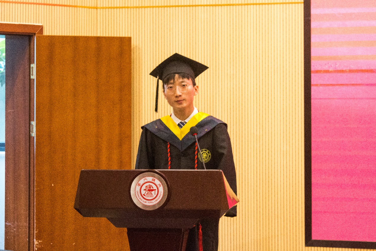 F16级楚召瀚同学作为学生代表发言,他说到:大学四年的学习经历,学院全面细致的学科设置,耐心负责的各位老师,都使他前行之路更加清晰明朗。环境学院带给了同学们更多的可能性,记录了每个人的成长,在毕业之际,同学们也一定不忘嘱托,脚踏实地,持续努力,与绿水青山一道同行,把青春献给祖国的山河。