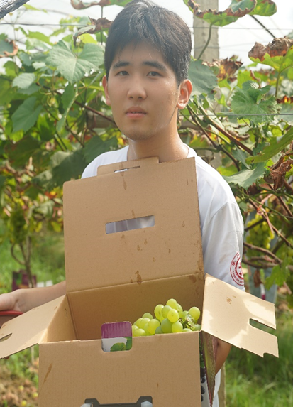 最后,实践团队来到了夹浦镇扶贫基地——吴城村葡萄帮扶基地。在扶贫基地工作人员的带领下,团队成员详细了解了当地的扶贫政策及产业。时下正值葡萄成熟的季节,团队成员认真学习各类葡萄的特征和名称,利用社交媒体开启了“线上+线下”相结合的形式进行网络直播带货。在整个直播过程中,有的同学强势“吃播”,大力宣传扶贫基地的各种葡萄;有的同学带起设备,深入葡萄架中,为观看直播的用户选取最香甜可口的葡萄。整个下午,直播间内最高在线人数高达3000余人,共完成交易50余笔,直播交易共计3000余元。