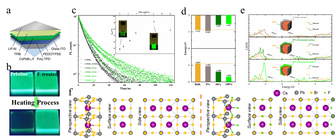 图 钙钛矿量子点钝化前后(a)电致发光器件结构,(b)荧光热淬灭实物图,(c)荧光量子效率及寿命,(d) 能带排布,(e) 局域态密度变化,(f)原子结构模拟