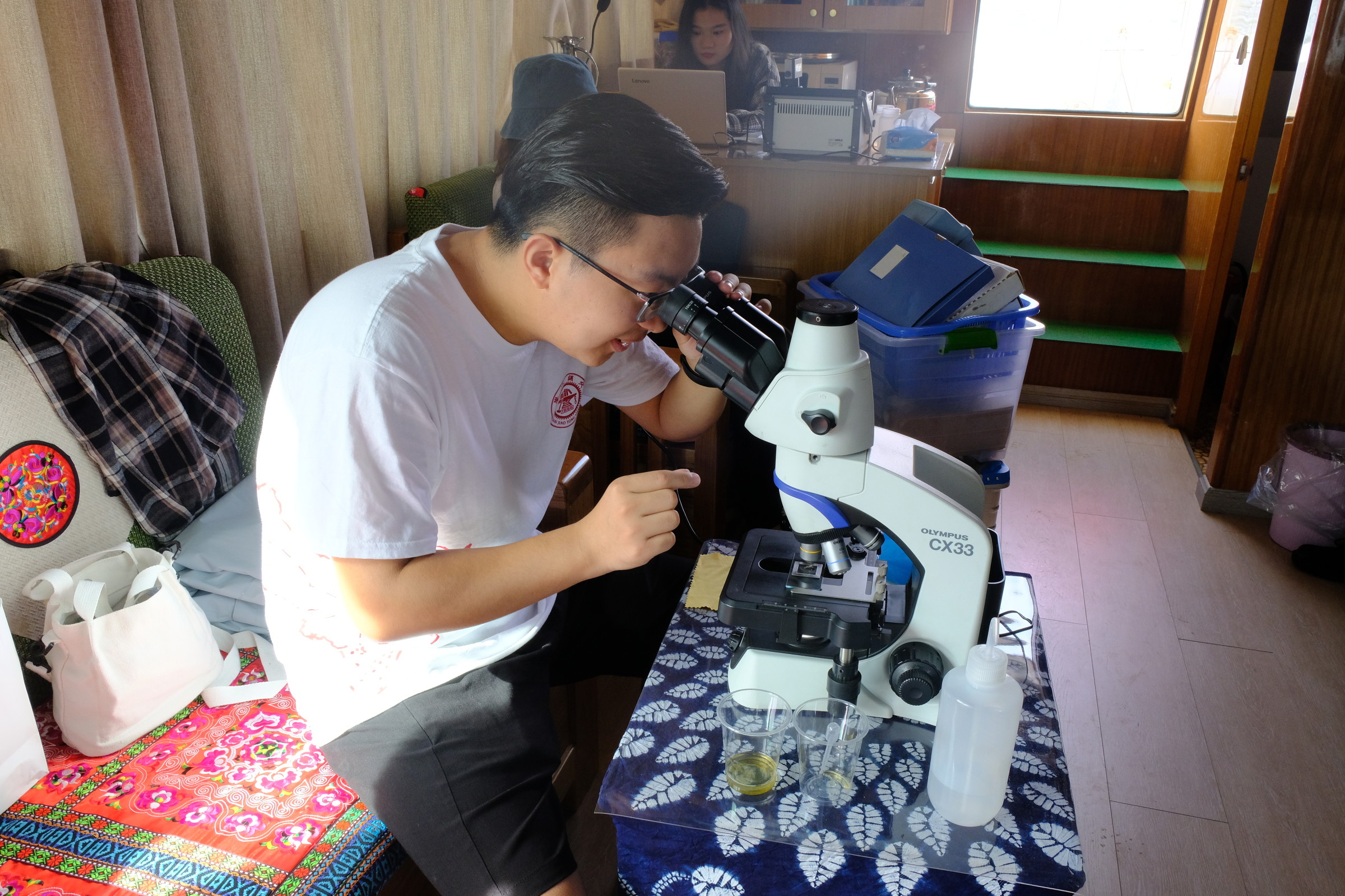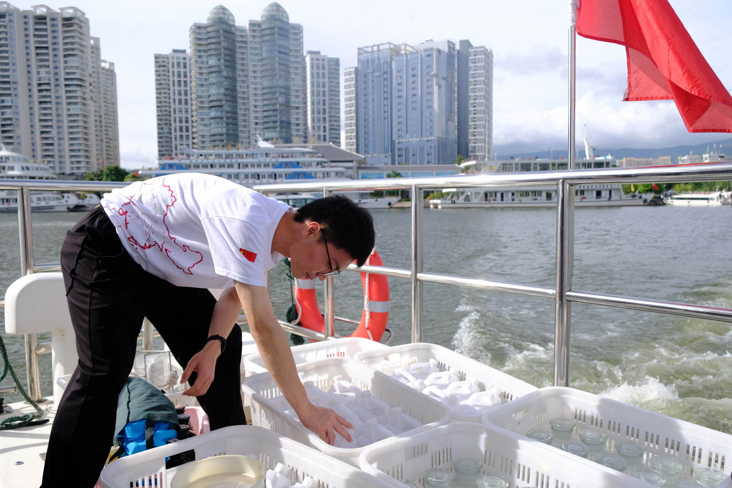 团队成员们向专业采样人员学习采样技术,在科研人员的指导下,利用自己的专业知识,理论与实践相结合,跟随着船只的节奏进行采样并在船上完成部分指标的检测。每个取样点分别取上层水和下层水,在现场进行了水温、浊度、pH、DO、藻类丰富度以及大气压等的检测,整个采样过程持续了3个多小时。