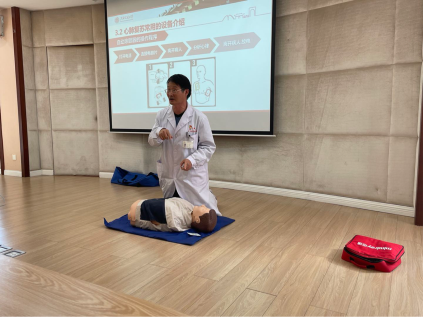 上海交大校医院院长刘金生副主任医师做应急救护安全培训。他从近期新冠肺炎的抗议防控工作救护讲起,重点介绍了心肺复苏并为大家进行了心肺复苏的现场演示和除颤器的使用演示。刘金生和同学们分享必备的急救与自救知识,提醒大家在努力学习工作的同时重视自我健康管理。