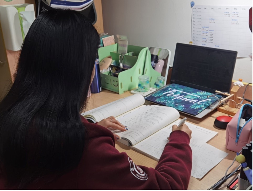 忻恺悦在宿舍学习