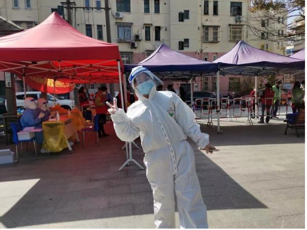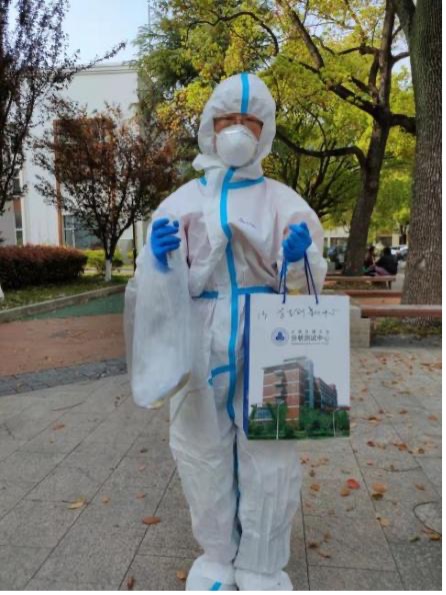 学院分析测试中心周伟丽老师主动请缨,发挥环境学科专业优势,组建校园环境核酸采样小分队,开展校内环境安全检测工作,用专业力量守护校园安全。她还担任办公楼楼长一职,负责组织楼内人员完成核酸检测、楼宇消杀、物资发放、数据录报等工作。在校内紧缺采样志愿者的关头,毅然选择留校坚守,继续奋战,坚持同心抗“疫”,共筑校园安全的“铜墙铁壁”。